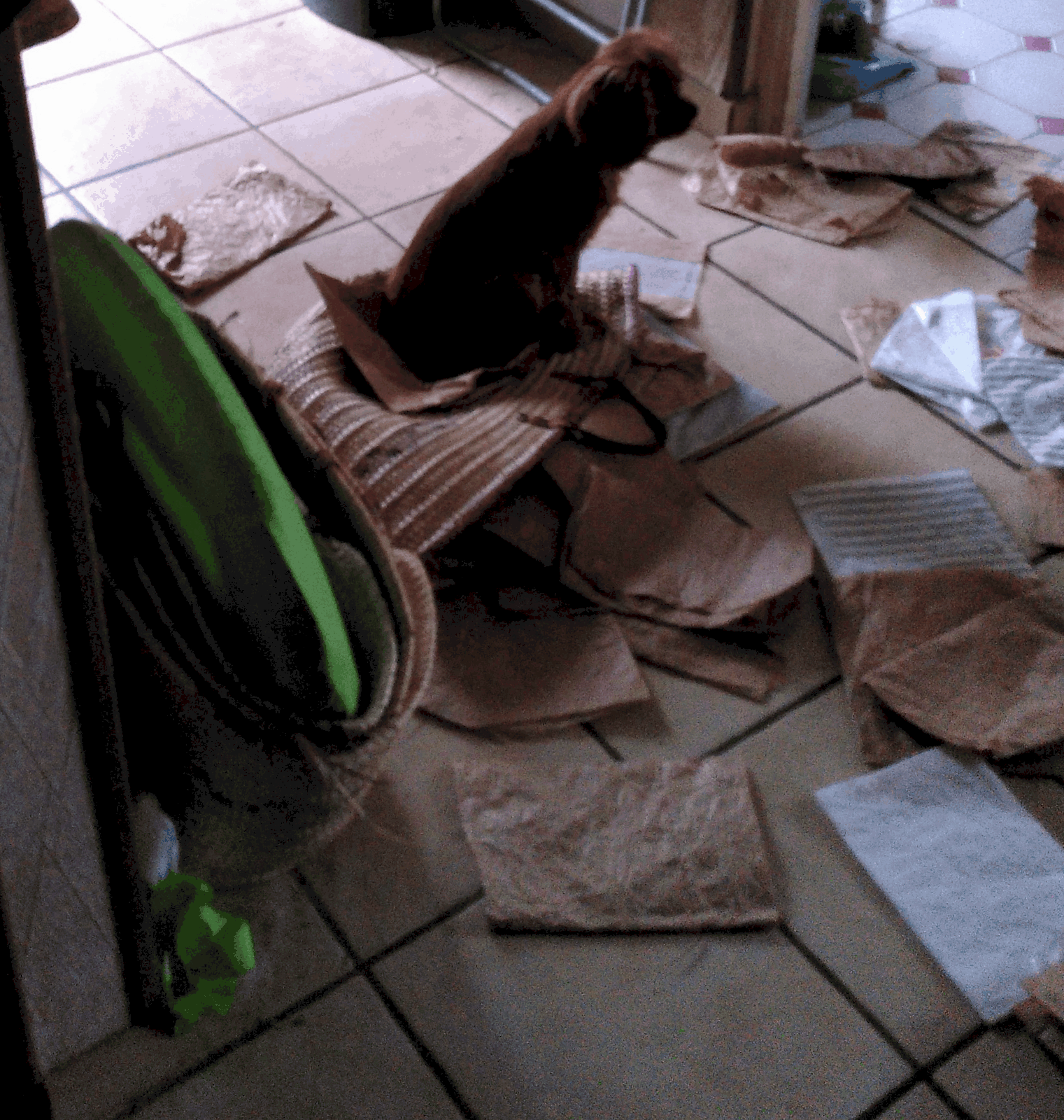 30/11/2022 C'est si amusant de vider le panier rempli de sacs en papier ... et puis prise en flagrant délit, Tara prend la pose de l'innocence incarnée.