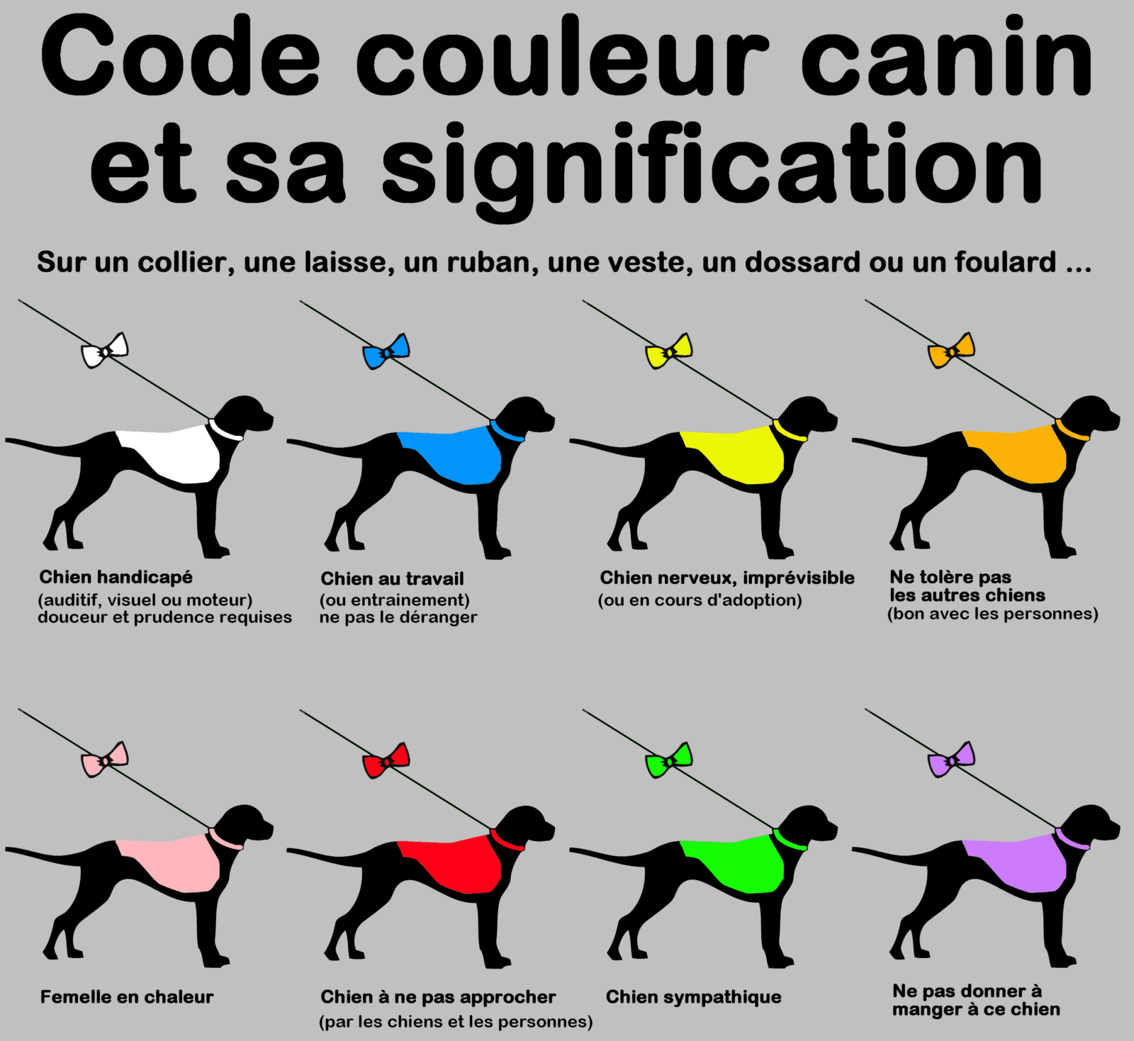 Le code couleur canin est un système où les couleurs utilisées sur les colliers, laisses et rubans indiquent la personnalité ou le comportement du chien afin de faciliter l’approche et la sécurité lors des interactions.