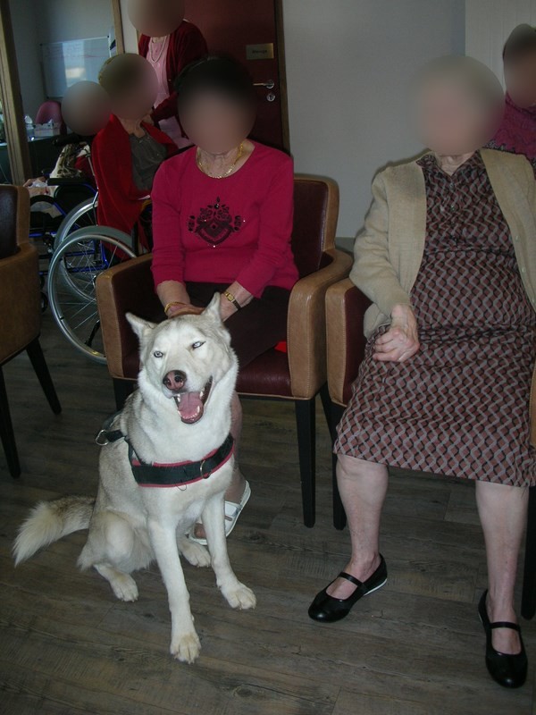 Jany nous accueille et s'excuse de ne pouvoir rester avec nous. Nous allons à l'unité protégée où trois dames s'intéressent à nos chiennes. Puis retour dans la grande salle et nous faisons le tour des résident(e)s. Aby retrouve les genoux d'une dame, Fripouille va vers la dame qui a peur des chiens (que Danièle arrive à chaque fois à convaincre de caresser les chiennes !), Evy se laisse caresser, ainsi que Smartie. Fripouille montre ce qu'elle sait faire comme d'habitude avec beaucoup de plaisir. L'heure passe vite.