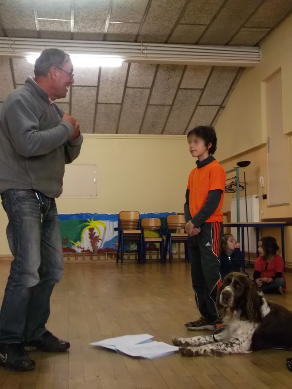 Christine a déjà assuré seule avec Orion l'intervention avec le premier groupe des enfants les moins mobiles. Ces enfants ont surtout un contact tactile avec la fourrure du chien. Je sais que je suis en retard, car je suis partie quand Christine déjà arrivée m'a téléphoné et a commencé.