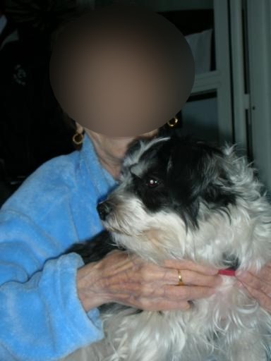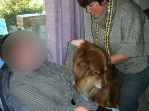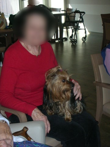 Nous sommes attendues, je fais prévenir Mr.C le "copain" d'Aby. Une nouvelle résidente ne comprend pas ce qu'elle fait là et pleure, nos chiennes tour à tour la consolent et nous obtenons un sourire. Mr.C fait des massages du cou à Aby, mais celle-ci doit laisser sa place à Evy, puis aux chiennes de Danièle, Fripouille pour un peu s'endormirait !
