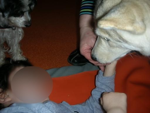 Puis voici D : le jeune garçon n'a pas peur et rit beaucoup de sentir le nez humide de Mala dans sa main. Il ne comprend pas bien le jeu des cachettes, mais le contact lui plaît ainsi que la distribution de friandises.