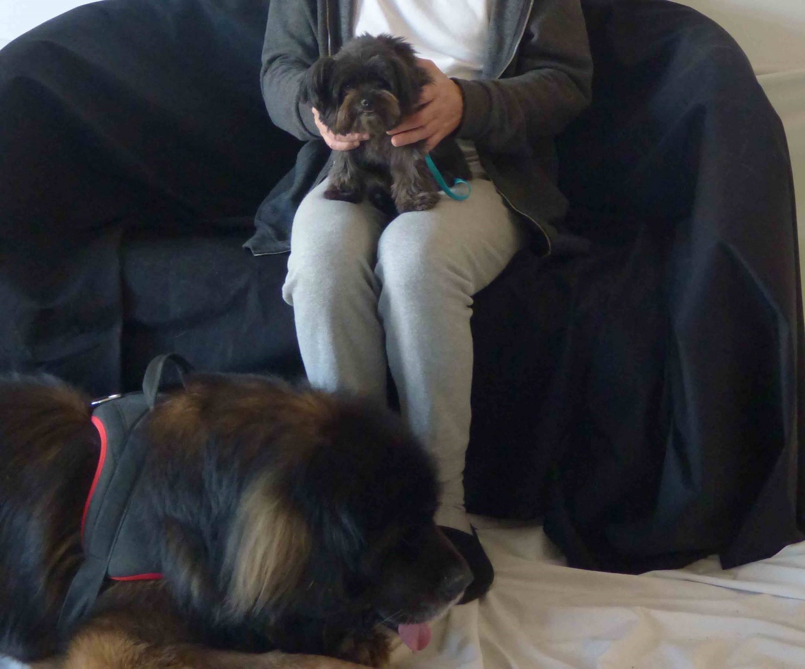 Ziyang couchée et Lily sur les genoux trop heureuse parce que Ziyang est son idole