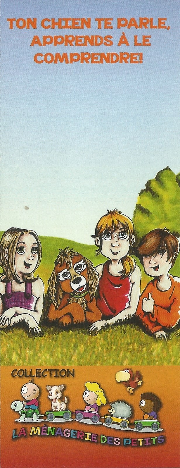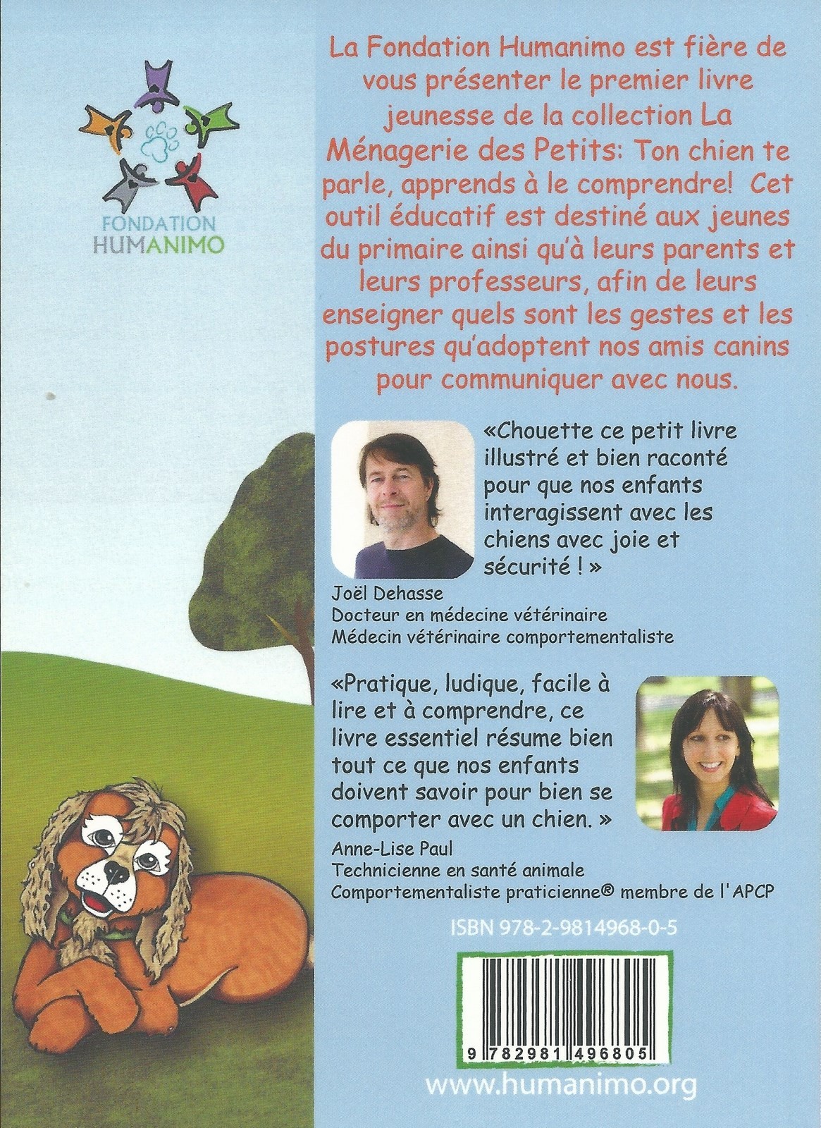 "Ton chien te parle, apprends à le comprendre !" est destiné aux enfants du primaire, aux parents ainsi qu’aux professeurs afin de leur permettre d’interpréter les gestes et les postures qu’adoptent nos amis canins lorsqu’ils communiquent avec nous. Cette idée originale de Kathleen Desrosiers, présidente de la fondation Humanimo, est magnifiquement illustrée par Nathali Ruel, fondatrice de Mon ami Muso. C’est d’ailleurs en s’inspirant de cette mascotte en milieu de garde familial que le petit mot de Muso a été ajouté à chacun des segments de ce livre, et chacun des personnages est inspiré des enfants et des animaux de Kathleen. Cet ouvrage présente plusieurs petites histoires illustrant des situations de la vie courante. Ainsi, une fois la lecture du livre terminé et les notions acquises, l’enfant reçoit un diplôme afin de l’encourager à mieux interagir avec les animaux et à transmettre son savoir.
